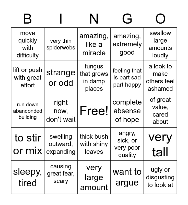 This bingo card has a free space and 41 words: bothersome or annoying, run down abandonded building, empty of people, sad emptiness, strange or odd, causing great fear, scary, thick bush with shiny leaves, fungus that grows in damp places, giving off light, especially in the dark, swallow large amounts loudly, to stir or mix, right now, don't wait, amazing, extremely good, ugly or disgusting to look at, of great value, cared about, complete absense of hope, swelling outward, expanding, very large, move quickly with difficulty, an assigned location, amazing, like a miracle, very tall, beautiful, amazing, very large amount, feeling that is part sad part happy, enourmous, very large, very hungry, want to argue, very impressive, a look to make others feel ashamed, showing disgust or anger, high pitched scream, very thin spiderwebs, sleepy, tired, unusually great, awesome, angry, sick, or very poor quality, lift or push with great effort, gross or disgusting, intent to cause harm, unsteady, uncontrolled movement, subtle but harmful and absurd or silly.