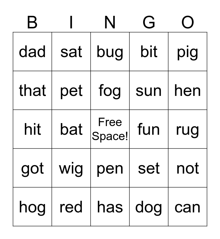 This bingo card has a free space and 24 words: wig, red, fog, hog, pig, dad, that, sat, fun, pen, sun, hit, set, not, pet, dog, rug, bug, hen, bat, can, got, bit and has.