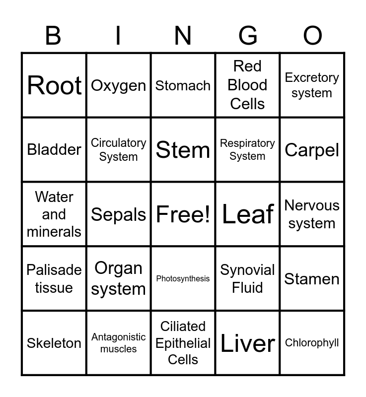 This bingo card has a free space and 24 words: Organ system, Antagonistic muscles, Stem, Skeleton, Excretory system, Root, Bladder, Oxygen, Leaf, Photosynthesis, Respiratory System, Water and minerals, Synovial Fluid, Stamen, Circulatory System, Liver, Nervous system, Stomach, Carpel, Sepals, Chlorophyll, Palisade tissue, Red Blood Cells and Ciliated Epithelial Cells.