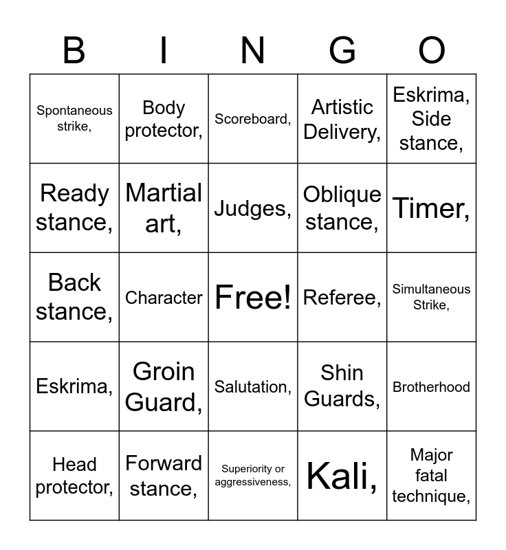 This bingo card has a free space and 34 words: Arnis,, Kali,, Padded stick,, Arnis,, Eskrima,, Martial art,, Eskrima, Side stance,, Head protector,, Body protector,, Flags,, Judges,, Scoreboard,, Stopwatch,, Wooden stick,, Referee,, Timer,, Forward stance,, Back stance,, Groin Guard,, Shin Guards,, Salutation,, Matching and Pairing,, Spontaneous strike,, Simultaneous Strike,, Superiority or aggressiveness,, Major fatal technique,, Artistic Delivery,, Foul and Disarming,, Oblique stance,, Ready stance,, Straddle stance, Character, Brotherhood and Self-defense.