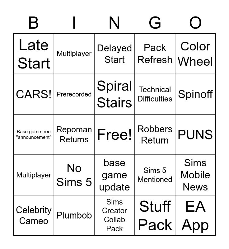 This bingo card has a free space and 24 words: No Sims 5, Plumbob, Spiral Stairs, Celebrity Cameo, Color Wheel, Late Start, CARS!, Multiplayer, Robbers Return, base game update, Technical Difficulties, Base game free "announcement", Sims 5 Mentioned, Sims Mobile News, Prerecorded, Stuff Pack, PUNS, Delayed Start, Spinoff, Repoman Returns, EA App, Multiplayer, Pack Refresh and Sims Creator Collab Pack.