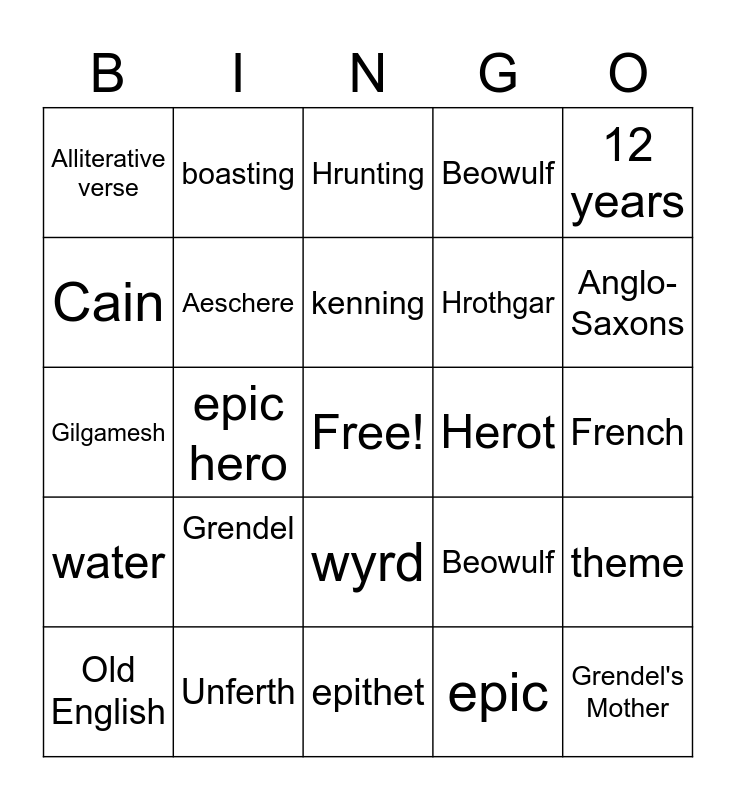 This bingo card has a free space and 24 words: Grendel, Unferth, kenning, Old English, 12 years, Alliterative verse, Cain, boasting, Herot, wyrd, Hrothgar, Gilgamesh, Beowulf, theme, Aeschere, epic, French, Hrunting, Anglo-Saxons, epic hero, Grendel's Mother, water, Beowulf and epithet.