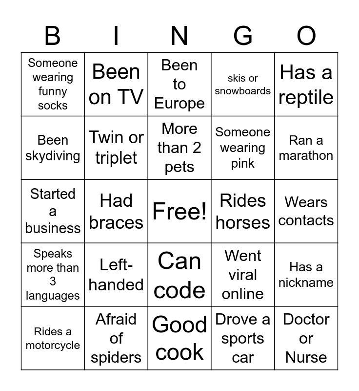This bingo card has a free space and 24 words: Left-handed, Afraid of spiders, More than 2 pets, Rides a motorcycle, Has a reptile, Someone wearing funny socks, Been skydiving, Been on TV, Rides horses, Can code, Someone wearing pink, Started a business, Went viral online, Has a nickname, Twin or triplet, Drove a sports car, Wears contacts, Been to Europe, Ran a marathon, Had braces, Doctor or Nurse, Speaks more than 3 languages, skis or snowboards and Good cook.