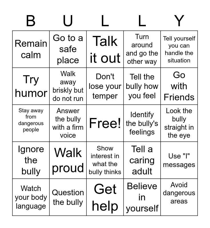 This bingo card has a free space and 24 words: Walk proud, Question the bully, Don't lose your temper, Watch your body language, Tell yourself you can handle the situation, Remain calm, Try humor, Go to a safe place, Identify the bully's feelings, Show interest in what the bully thinks, Tell the bully how you feel, Stay away from dangerous people, Tell a caring adult, Use "I" messages, Walk away briskly but do not run, Believe in yourself, Look the bully straight in the eye, Talk it out, Go with Friends, Answer the bully with a firm voice, Avoid dangerous areas, Ignore the bully, Turn around and go the other way and Get help.