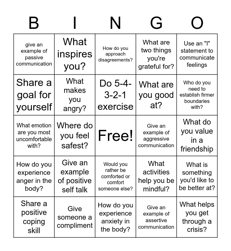 This bingo card has a free space and 24 words: Give an example of positive self talk, Give someone a compliment, Do 5-4-3-2-1 exercise, Share a positive coping skill, Use an "I" statement to communicate feelings, give an example of passive communication, Share a goal for yourself, What inspires you?, Give an example of aggressive communication, Would you rather be comforted or comfort someone else?, What are you good at?, What emotion are you most uncomfortable with?, What activities help you be mindful?, What is something you'd like to be better at?, What makes you angry?, Give an example of assertive communication, What do you value in a friendship, How do you approach disagreements?, Who do you need to establish firmer boundaries with?, Where do you feel safest?, What helps you get through a crisis?, How do you experience anger in the body?, What are two things you're grateful for? and How do you experience anxiety in the body?.
