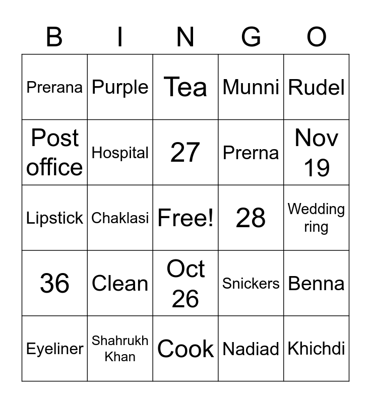 This bingo card has a free space and 50 words: Rotla, Khichdi, Pav bhaji, Cook, Clean, Green, Purple, Red, Post office, Laundromat, Hospital, Munni, Benna, Snickers, Twix, Reese’s, 27, 28, 26, Rudel, Chaklasi, Nadiad, Prerana, Prerna, Nov 17, Nov 18, Nov 19, Coffee, Tea, Oct 26, Oct 27, Oct 28, Amir khan, Hrithik Roshan, Shahrukh Khan, Roasted coconut, Orange pineapple, Mango, Apple Watch, Wedding ring, Mangal sutra, Scorpio, Gemini, Taurus, Eyeliner, Lipstick, Mascara, 38, 36 and 37.