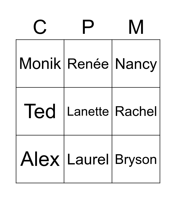 This bingo card has 9 words: Alex, Nancy, Renée, Ted, Monik, Rachel, Lanette, Bryson and Laurel.