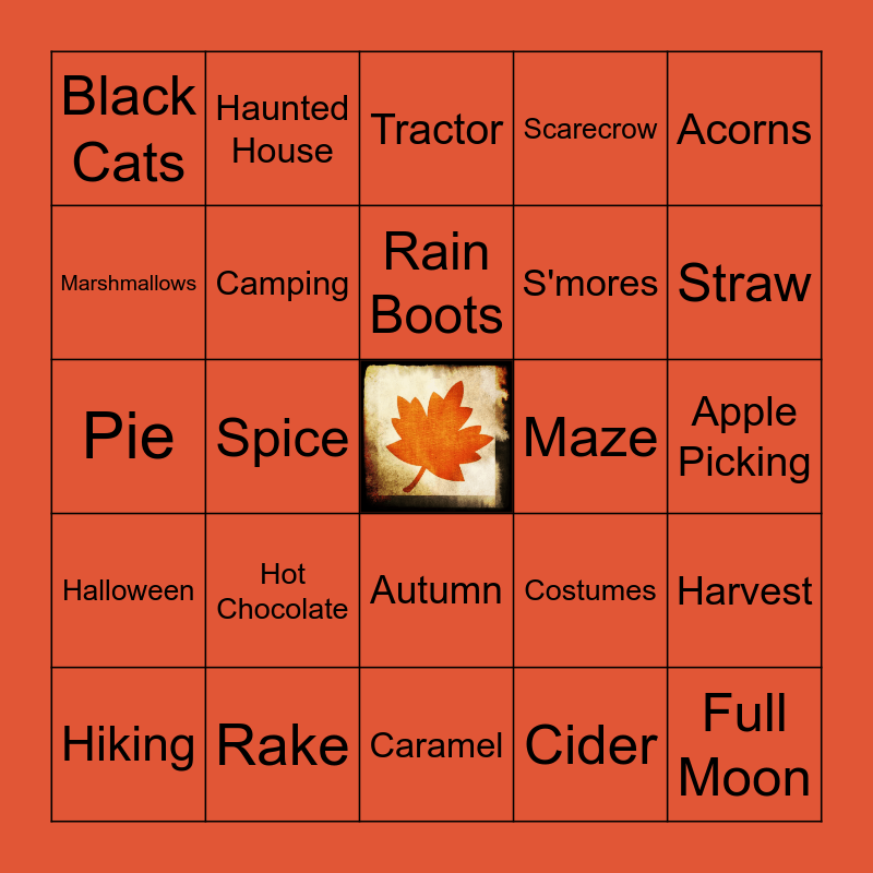 This bingo card has a free space and 24 words: Hot Chocolate, Rake, Rain Boots, Hiking, Acorns, Black Cats, Marshmallows, Haunted House, Maze, Autumn, S'mores, Pie, Costumes, Harvest, Camping, Cider, Apple Picking, Tractor, Straw, Spice, Full Moon, Halloween, Scarecrow and Caramel.