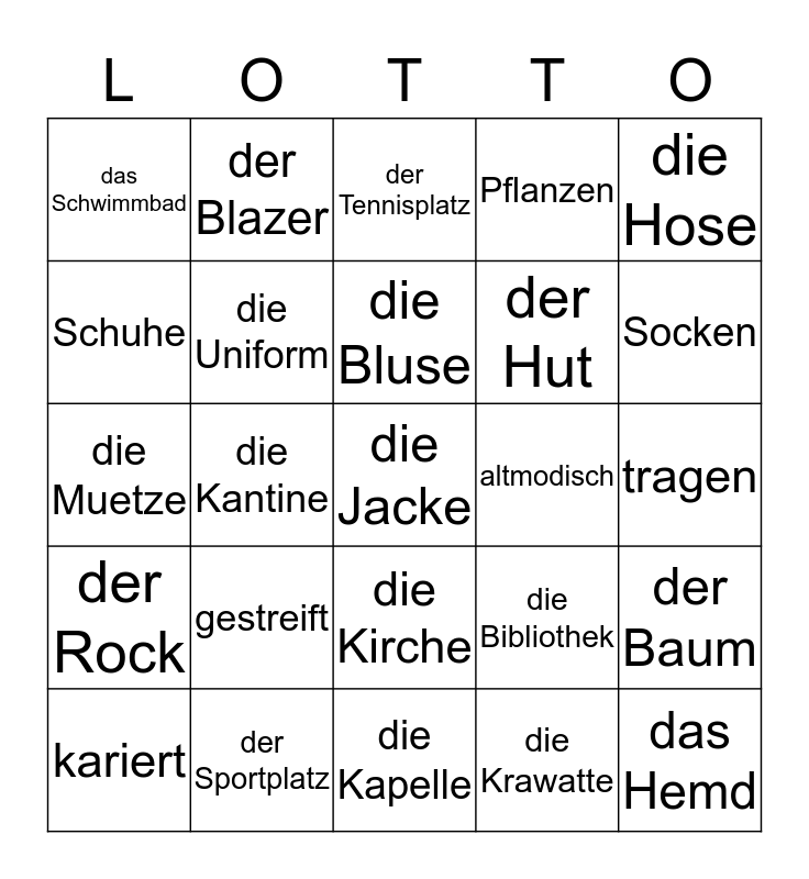 This bingo card has 25 words: gestreift, die Kapelle, die Bluse, kariert, die Hose, das Schwimmbad, Schuhe, der Blazer, altmodisch, die Kirche, der Hut, die Muetze, die Bibliothek, der Baum, die Uniform, das Hemd, tragen, der Tennisplatz, Socken, die Kantine, die Jacke, der Sportplatz, der Rock, Pflanzen and die Krawatte.