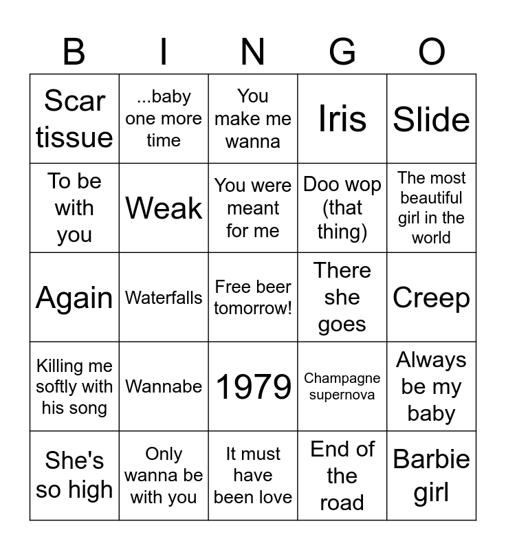 This bingo card has a free space and 49 words: Gangsta's paradise, Barbie girl, Fantasy, It must have been love, Wannabe, Nothing compares 2 U, ...baby one more time, California love, To be with you, Torn, Weak, Iris, Always be my baby, Champagne supernova, Crash into me, Santeria, You were meant for me, There she goes, 3AM, Slide, Waterfalls, End of the road, Scar tissue, Doo wop (that thing), Return of the mack, The most beautiful girl in the world, She's so high, No scrubs, 1979, Killing me softly with his song, The boy is mine, All my life, Push, Whatta man, Only wanna be with you, Good riddance, Buddy holly, Santa monica, Creep, You're still the one, Semi charmed life, High and dry, My hero, Under the bridge, Again, You make me wanna, Thank you, Bills, bills, bills and Kiss me.