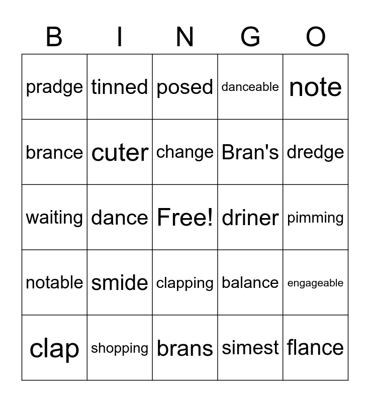 This bingo card has a free space and 39 words: gape, gaping, cute, cuter, clap, clapping, change, changeable, note, notable, dance, danceable, flance, pimming, driner, smide, smidest, pradge, prage, balance, brance, brans, Bran's, dredge, Frobish, futing, spiny, spine, finer, tinned, engage, fidge, posed, shopping, simest, engaging, engageable, waiting and wade.