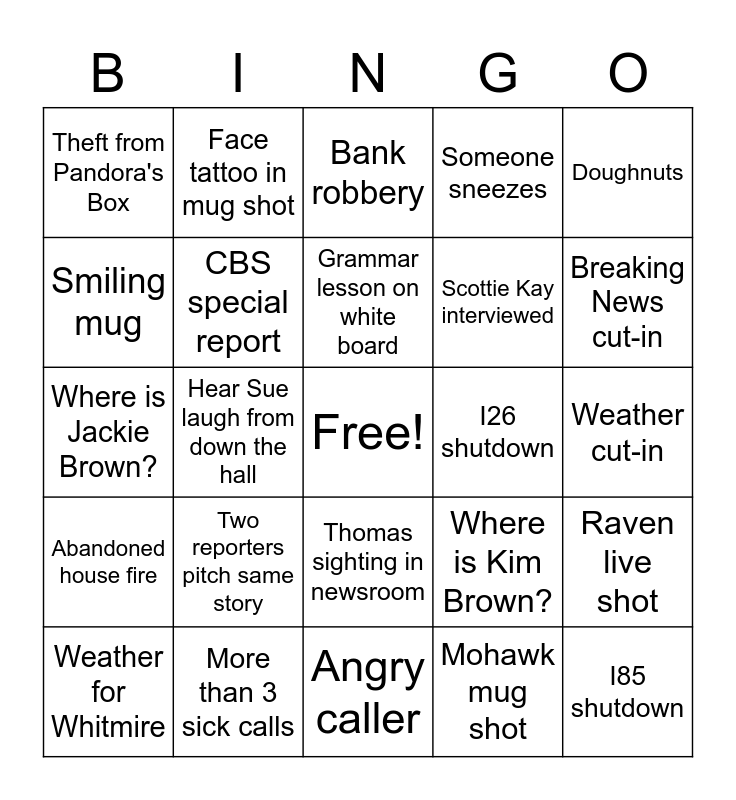 This bingo card has a free space and 38 words: Pete asks for scissors, Miss Betty calls, Jonathan in newsroom, CBS special report, Raven live shot, Two reporters pitch same story, Grammar lesson on white board, Lost $ in vending machine, Doughnuts, Scottie Kay interviewed, Hear Sue laugh from down the hall, Someone sneezes, I85 shutdown, Weather cut-in, Smiling mug, Abandoned house fire, Flat tire in parking lot, Bank robbery, Mel has trivia trophy, I26 shutdown, Theft from Pandora's Box, More than 3 sick calls, Breaking News cut-in, Weather for Whitmire, Hear thunder from inside newsroom, Angry caller, Jail mail arrives, "completely destroyed" in script, Squawk box announcement, Kenny sighting, Anchors wear same color, Thomas sighting in newsroom, Mohawk mug shot, Face tattoo in mug shot, Newsroom pizza, Where is Kim Brown?, Where is Jackie Brown? and Creative standup.