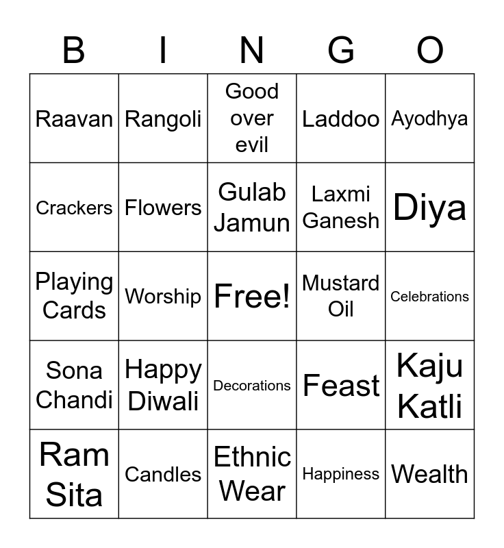 This bingo card has a free space and 24 words: Happy Diwali, Candles, Gulab Jamun, Ram Sita, Ayodhya, Raavan, Crackers, Rangoli, Mustard Oil, Decorations, Laxmi Ganesh, Playing Cards, Feast, Kaju Katli, Flowers, Happiness, Celebrations, Good over evil, Diya, Worship, Wealth, Sona Chandi, Laddoo and Ethnic Wear.