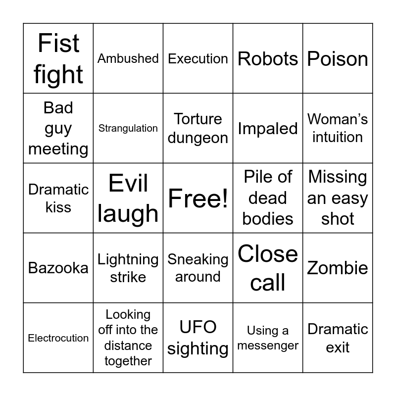 This bingo card has a free space and 24 words: Lightning strike, Looking off into the distance together, Torture dungeon, Electrocution, Poison, Fist fight, Bad guy meeting, Ambushed, Pile of dead bodies, Sneaking around, Impaled, Dramatic kiss, Close call, Zombie, Strangulation, Using a messenger, Missing an easy shot, Execution, Woman’s intuition, Evil laugh, Dramatic exit, Bazooka, Robots and UFO sighting.