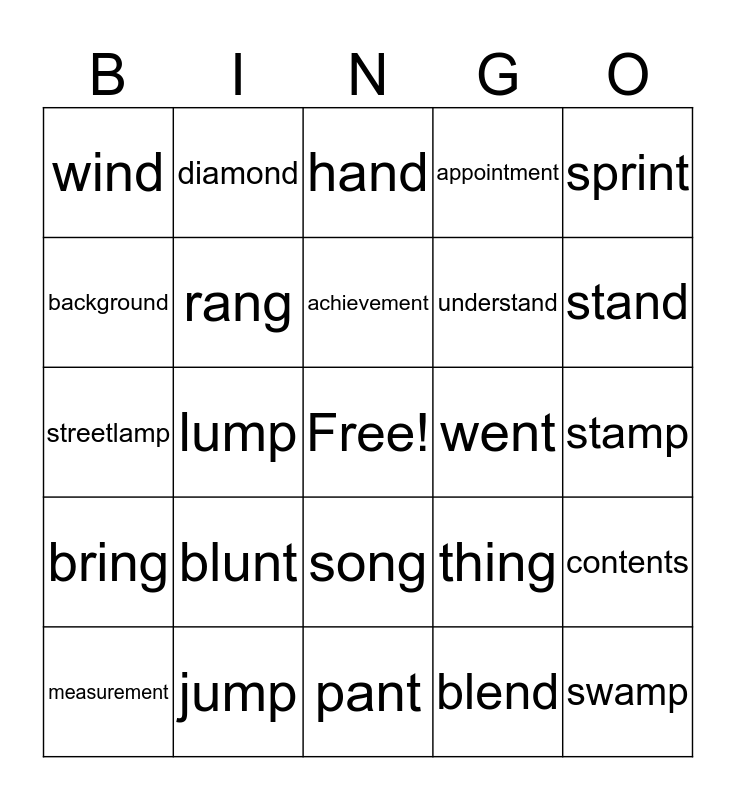 This bingo card has a free space and 30 words: jump, lamp, lump, send, wind, hand, rang, song, went, pant, stamp, swamp, blend, grand, stand, spring, thing, bring, blunt, sprint, streetlamp, lifelong, diamond, understand, background, appointment, contents, measurement, achievement and continent.