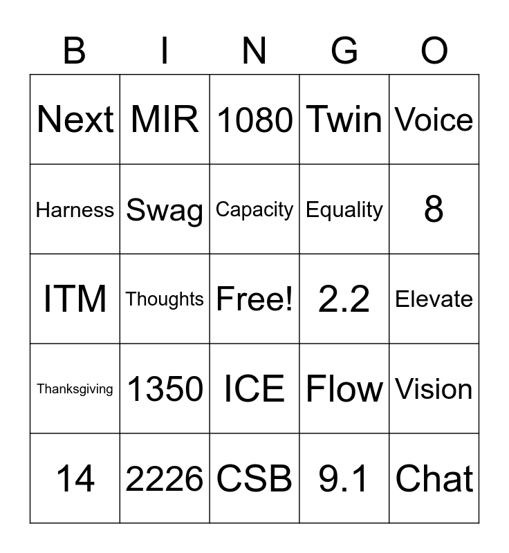 This bingo card has a free space and 24 words: 1350, 2226, Capacity, 14, Voice, Next, Harness, MIR, 2.2, ICE, Equality, ITM, Flow, Vision, Swag, 9.1, Elevate, 1080, 8, Thoughts, Chat, Thanksgiving, Twin and CSB.