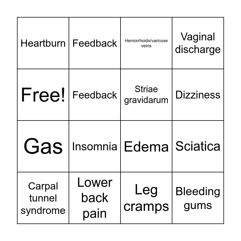 This bingo card has 16 words: Lower back pain, Sciatica, Hemorrhoids/varicose veins, Heartburn, Gas, Feedback, Edema, Leg cramps, Free!, Feedback, Carpal tunnel syndrome, Vaginal discharge, Insomnia, Dizziness, Striae gravidarum and Bleeding gums.