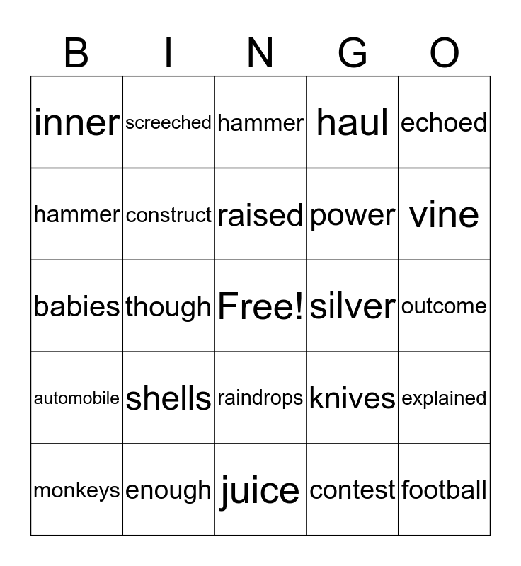 This bingo card has a free space and 32 words: contest, attach, though, machine, automobile, construct, echoed, explained, screeched, peeled, raised, hammer, inner, juice, silver, vine, monkeys, babies, raindrops, shells, knives, threw, outcome, enough, football, haul, power, hammer, inner, juice, silver and vine.