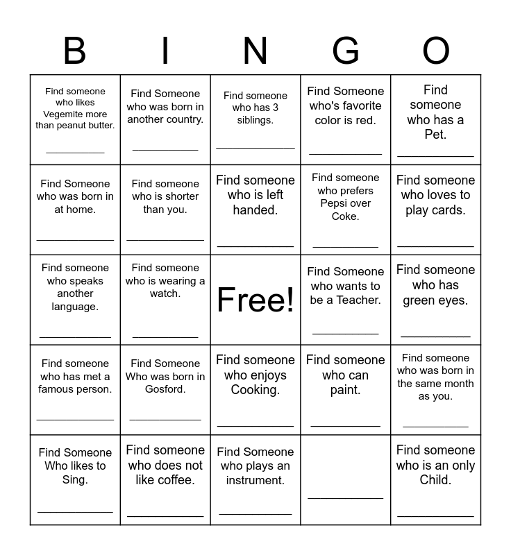 This bingo card has a free space and 25 words: Find Someone Who was born in Gosford. ____________, Find Someone who plays an instrument. ___________, Find someone who is left handed. ___________, Find Someone Who likes to Sing. ____________, Find someone who has a Pet. ___________, Find someone who likes Vegemite more than peanut butter. ___________, Find Someone who was born in at home. _____________, Find Someone who was born in another country. ___________, Find Someone who wants to be a Teacher. __________, Find someone who enjoys Cooking. ___________, Find someone who prefers Pepsi over Coke. ___________, Find someone who speaks another language. ____________, Find someone who can paint. __________, Find someone who was born in the same month as you. ___________, Find someone who is shorter than you. _____________, Find someone who has been on a cruise. ___________, Find someone who has green eyes. __________, Find someone who has 3 siblings. ______________, Find someone who loves to play cards. ___________, Find someone who is wearing a watch. ___________, Find someone who is an only Child. ___________, Find someone who does not like coffee. ___________, Find someone who has met a famous person. _____________, Find Someone who's favorite color is red. ___________ and ____________.