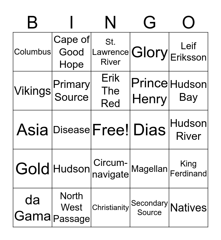 This bingo card has a free space and 24 words: Hudson, North West Passage, Erik The Red, da Gama, Leif Eriksson, Columbus, Vikings, Cape of Good Hope, Dias, Circum-navigate, Prince Henry, Asia, Magellan, King Ferdinand, Primary Source, Secondary Source, Hudson River, St. Lawrence River, Hudson Bay, Disease, Natives, Gold, Glory and Christianity.