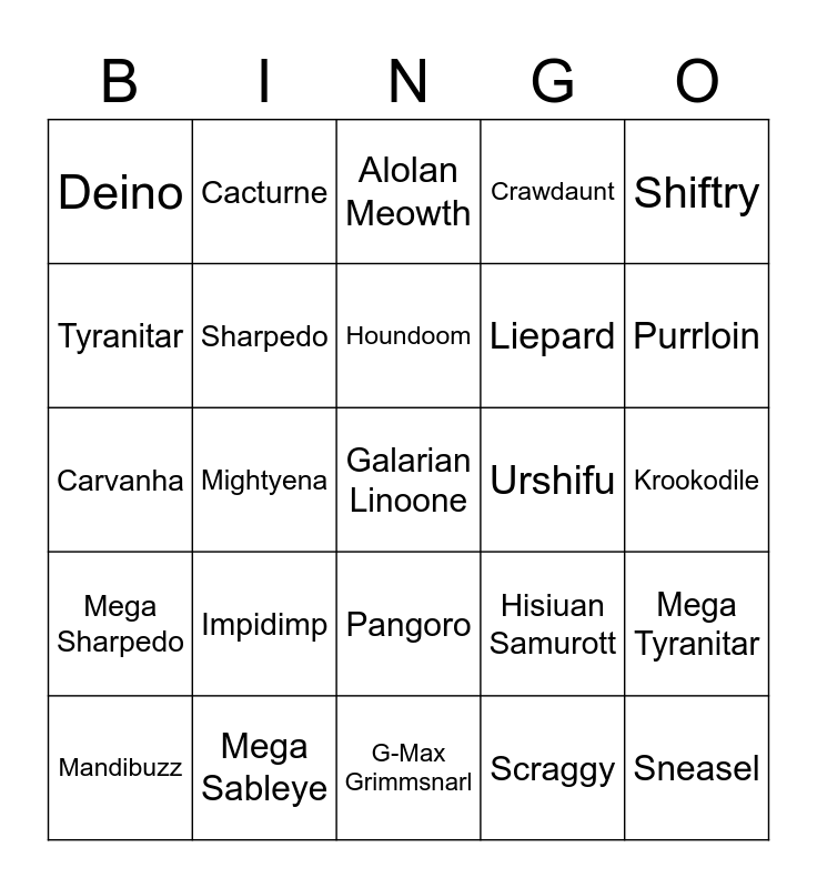 This bingo card has 75 words: Alolan Rattata, Alolan Raticate, Alolan Meowth, Alolan Persian, Alolan Grimer, Alolan Muk, Galarian Moltres, Umbreon, Murkrow, Hisiuan Qwilfish, Sneasel, Houndour, Houndoom, Tyranitar, Poochyena, Mightyena, Galarian Zigzagoon, Galarian Linoone, Nuzleaf, Shiftry, Sableye, Carvanha, Sharpedo, Cacturne, Crawdaunt, Absol, Honchkrow, Stunky, Skuntank, Spiritomb, Drapion, Weavile, Darkrai, Hisiuan Samurott, Purrloin, Liepard, Sandile, Krokorok, Krookodile, Scraggy, Scrafty, Zorua, Zoroark, Pawniard, Bisharp, Vullaby, Mandibuzz, Deino, Zweilous, Hydreigon, Greninja, Pangoro, Inkay, Malamar, Yveltal, Hoopa Unbound, Incineroar, Guzzlord, Nickit, Thievul, Impidimp, Morgrem, Grimmsnarl, Obstagoon, Morpeko, Urshifu, Zarude, Overqwil, Mega Houndoom, Mega Tyranitar, Mega Sharpedo, Mega Sableye, Mega Absol, G-Max Grimmsnarl and G-Max Urshifu.