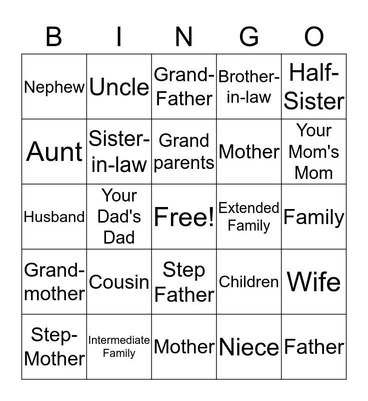 This bingo card has a free space and 24 words: Cousin, Intermediate Family, Grand parents, Step- Mother, Half- Sister, Nephew, Aunt, Uncle, Extended Family, Step Father, Mother, Husband, Children, Wife, Sister-in-law, Niece, Family, Grand- Father, Your Mom's Mom, Your Dad's Dad, Father, Grand-mother, Brother-in-law and Mother.