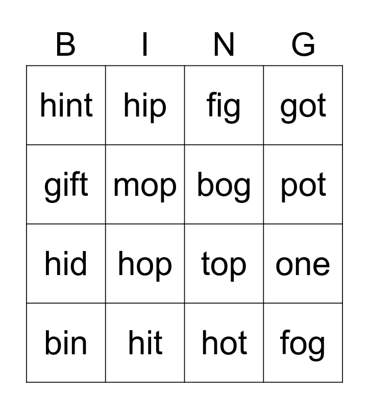 This bingo card has 20 words: one, pit, fig, dog, bin, gift, hit, hint, hid, hip, hop, top, mop, fog, bog, mog, pot, got, hot and rot.