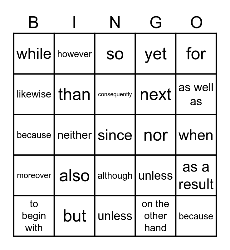 This bingo card has 30 words: but, until, neither, as of, while, so, than, although, nor, unless, when, since, on the other hand, because, as well as, for, unless, moreover, also, for, because, therefore, however, next, likewise, yet, as a result, to begin with, consequently and and.