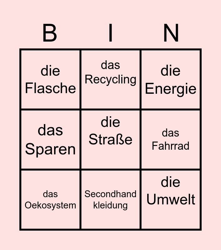 This bingo card has a free space and 8 words: das Fahrrad, die Energie, das Recycling, das Oekosystem, die Flasche, die Umwelt, das Sparen and Secondhand kleidung.