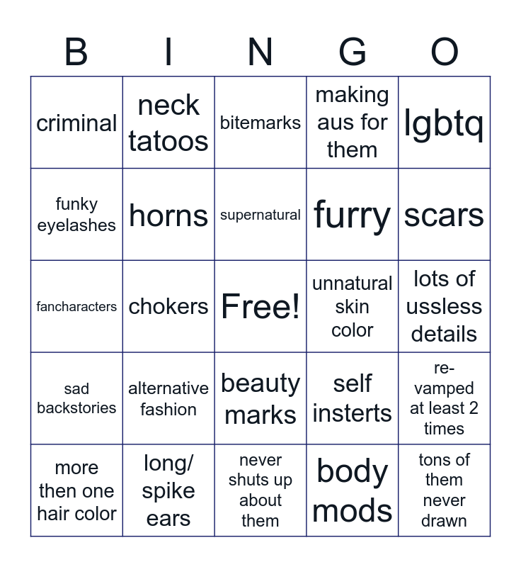 This bingo card has a free space and 24 words: alternative fashion, long/ spike ears, supernatural, more then one hair color, lgbtq, criminal, funky eyelashes, neck tatoos, unnatural skin color, beauty marks, furry, fancharacters, self insterts, re-vamped at least 2 times, horns, body mods, lots of ussless details, bitemarks, scars, chokers, tons of them never drawn, sad backstories, making aus for them and never shuts up about them.