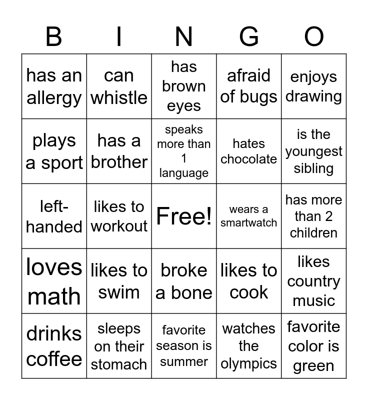 This bingo card has a free space and 35 words: Has a pet, Was born in another state, wears glasses, has a brother, broke a bone, afraid of bugs, plays a sport, traveled outside the USA, speaks more than 1 language, has a birthmark, left-handed, enjoys drawing, can ride a bike, read more than 2 books last month, has an allergy, wears a smartwatch, watches the olympics, likes to workout, loves math, favorite color is green, likes to cook, drinks coffee, likes country music, sleeps on their stomach, has brown eyes, is the youngest sibling, been on a cruise, likes to play cards, hates chocolate, has more than 2 children, likes scary movies, favorite season is summer, likes to swim, can whistle and has met a celebrity.