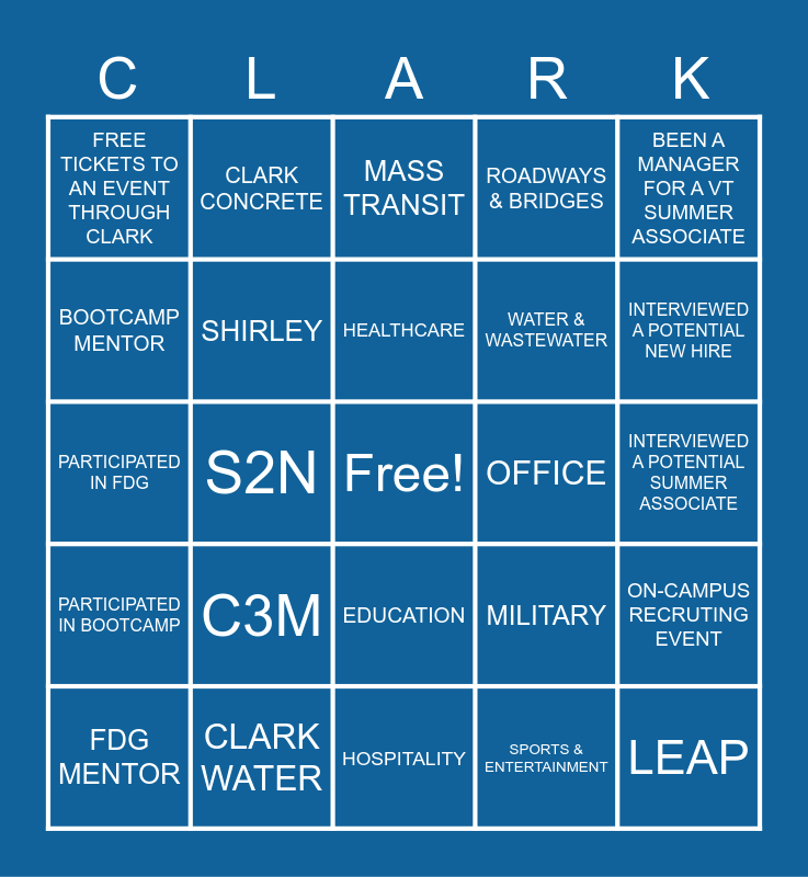 This bingo card has a free space and 39 words: TEAM CLARK MENTOR, EDGEMOORE, AVIATION, MILITARY, ON-CAMPUS RECRUTING EVENT, PARTICIPATED IN BOOTCAMP, S2N, CORRECTIONAL & JUDICIAL, OFFICE, INTERVIEWED A POTENTIAL SUMMER ASSOCIATE, BOOTCAMP MENTOR, CLARK CONCRETE, RESIDENTIAL & MIXED-USE, INTERVIEWED A POTENTIAL NEW HIRE, PARTICIPATED IN FDG, C3M, EDUCATION, ROADWAYS & BRIDGES, LEAD A CLARK INFO SESSION, FDG MENTOR, SHIRLEY, HEALTHCARE, SPORTS & ENTERTAINMENT, BEEN A MANAGER FOR A VT SUMMER ASSOCIATE, INTERMURAL CLARK TEAM, CLARK WATER, HOSPITALITY, DISTRIBUTION, GAVE A LEADER PRESENTATION AT ENGINEER INTERVIEW DAY, FREE TICKETS TO AN EVENT THROUGH CLARK, CODA, INTERIORS, WATER & WASTEWATER, LEAP, BLDR, FOUNDATIONS, MASS TRANSIT, HOLA and WIN.