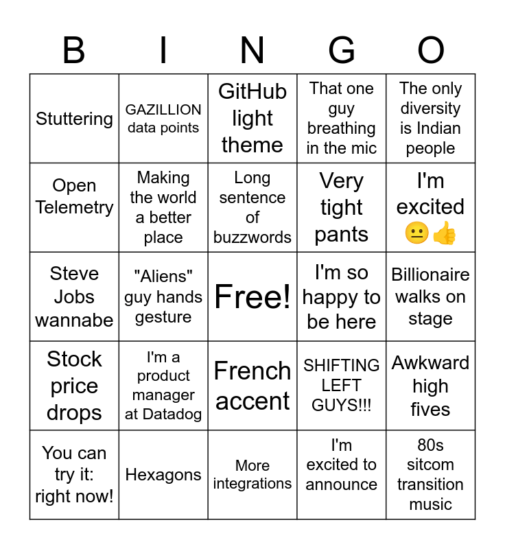 This bingo card has a free space and 24 words: I'm a product manager at Datadog, Hexagons, Long sentence of buzzwords, You can try it: right now!, The only diversity is Indian people, Stuttering, Open Telemetry, GAZILLION data points, I'm so happy to be here, French accent, Very tight pants, Steve Jobs wannabe, SHIFTING LEFT GUYS!!!, Awkward high fives, Making the world a better place, I'm excited to announce, Billionaire walks on stage, GitHub light theme, I'm excited 😐👍, "Aliens" guy hands gesture, 80s sitcom transition music, Stock price drops, That one guy breathing in the mic and More integrations.