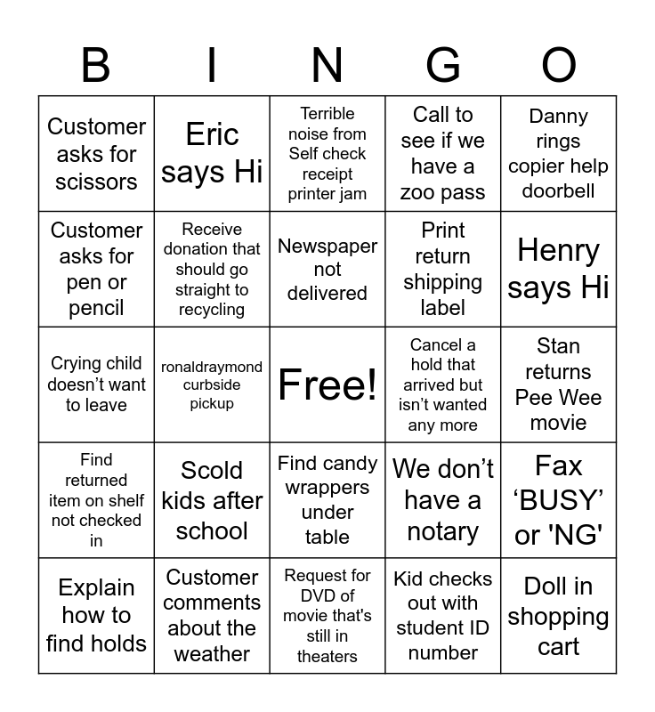 This bingo card has a free space and 24 words: Scold kids after school, Customer comments about the weather, Newspaper not delivered, Explain how to find holds, Danny rings copier help doorbell, Customer asks for scissors, Customer asks for pen or pencil, Eric says Hi, Cancel a hold that arrived but isn’t wanted any more, Find candy wrappers under table, Print return shipping label, Crying child doesn’t want to leave, We don’t have a notary, Fax ‘BUSY’ or 'NG', Receive donation that should go straight to recycling, Kid checks out with student ID number, Stan returns Pee Wee movie, Terrible noise from Self check receipt printer jam, Henry says Hi, ronaldraymond curbside pickup, Doll in shopping cart, Find returned item on shelf not checked in, Call to see if we have a zoo pass and Request for DVD of movie that's still in theaters.