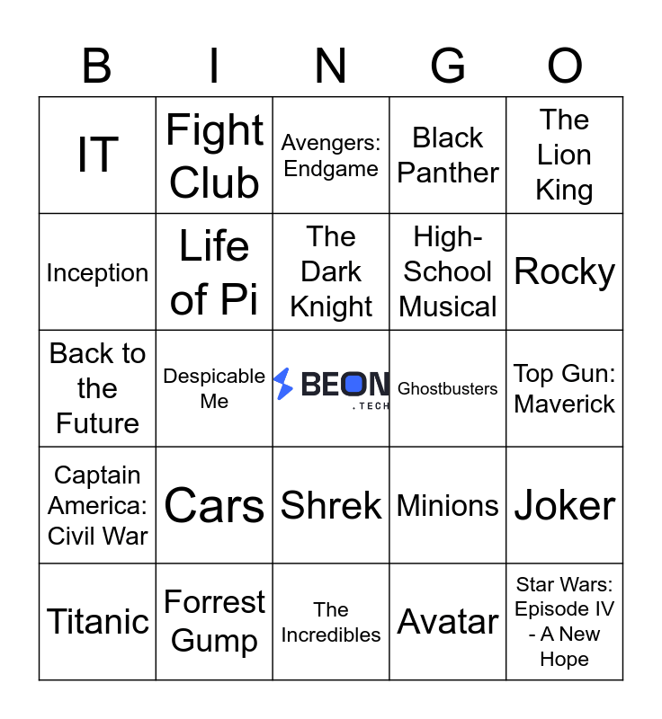 This bingo card has a free space and 45 words: The Godfather, Star Wars: Episode IV - A New Hope, E. T. The Extra-Terrestrial, Titanic, 101 Dalmatians, Avatar, Avengers: Endgame, Jurassic Park, The Lion King, Forrest Gump, Black Panther, Ghostbusters, Shrek, Cars, Home Alone, The Incredibles, Finding Nemo, Back to the Future, Harry Potter and the Sorcerer's Stone, Rocky, Fight Club, Men in Black, Pulp Ficiton, IT, Fast and Furious, Top Gun: Maverick, Frozen, Beauty and the Beast, Minions, Captain America: Civil War, Spiderman: No Way Home, Joker, Toy Story, Aladdin, Pirates of the Caribbean, Despicable Me, Alice in Wonderland, Zootopia, The Hobbit: An Unexpected Journey, The Dark Knight, Inception, High-School Musical, The Matrix, Life of Pi and Interstellar.