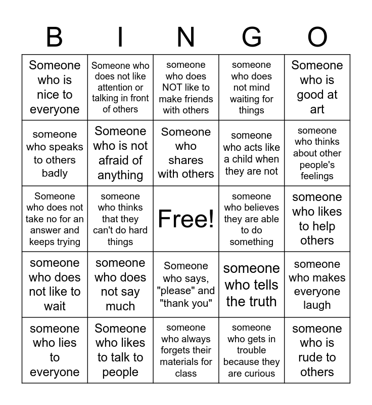 This bingo card has a free space and 24 words: someone who does not say much, Someone who likes to talk to people, Someone who shares with others, someone who lies to everyone, Someone who is good at art, Someone who is nice to everyone, someone who speaks to others badly, Someone who does not like attention or talking in front of others, someone who believes they are able to do something, Someone who says, "please" and "thank you", someone who acts like a child when they are not, Someone who does not take no for an answer and keeps trying, someone who tells the truth, someone who makes everyone laugh, Someone who is not afraid of anything, someone who gets in trouble because they are curious, someone who likes to help others, someone who does NOT like to make friends with others, someone who thinks about other people's feelings, someone who thinks that they can't do hard things, someone who is rude to others, someone who does not like to wait, someone who does not mind waiting for things and someone who always forgets their materials for class.