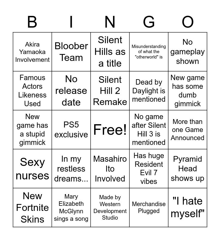 This bingo card has a free space and 24 words: In my restless dreams..., Mary Elizabeth McGlynn sings a song, Silent Hill 2 Remake, New Fortnite Skins, No gameplay shown, Akira Yamaoka Involvement, Famous Actors Likeness Used, Bloober Team, No game after Silent Hill 3 is mentioned, Masahiro Ito Involved, Dead by Daylight is mentioned, New game has a stupid gimmick, Has huge Resident Evil 7 vibes, Pyramid Head shows up, No release date, Merchandise Plugged, More than one Game Announced, Silent Hills as a title, New game has some dumb gimmick, PS5 exclusive, "I hate myself", Sexy nurses, Misunderstanding of what the "otherworld" is and Made by Western Development Studio.