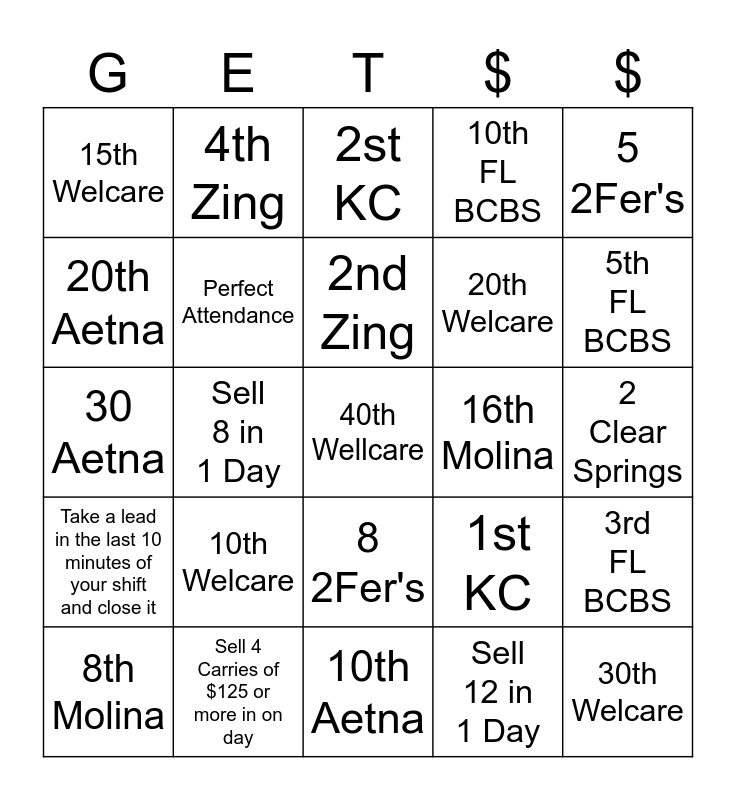 This bingo card has 25 words: 10th Welcare, 10th Aetna, 2nd Zing, 8th Molina, 5 2Fer's, 15th Welcare, 20th Aetna, 4th Zing, 16th Molina, 8 2Fer's, 20th Welcare, 30 Aetna, 1st KC, 3rd FL BCBS, Perfect Attendance, 30th Welcare, 2 Clear Springs, 2st KC, 5th FL BCBS, Sell 8 in 1 Day, 40th Wellcare, Sell 4 Carries of $125 or more in on day, Take a lead in the last 10 minutes of your shift and close it, 10th FL BCBS and Sell 12 in 1 Day.