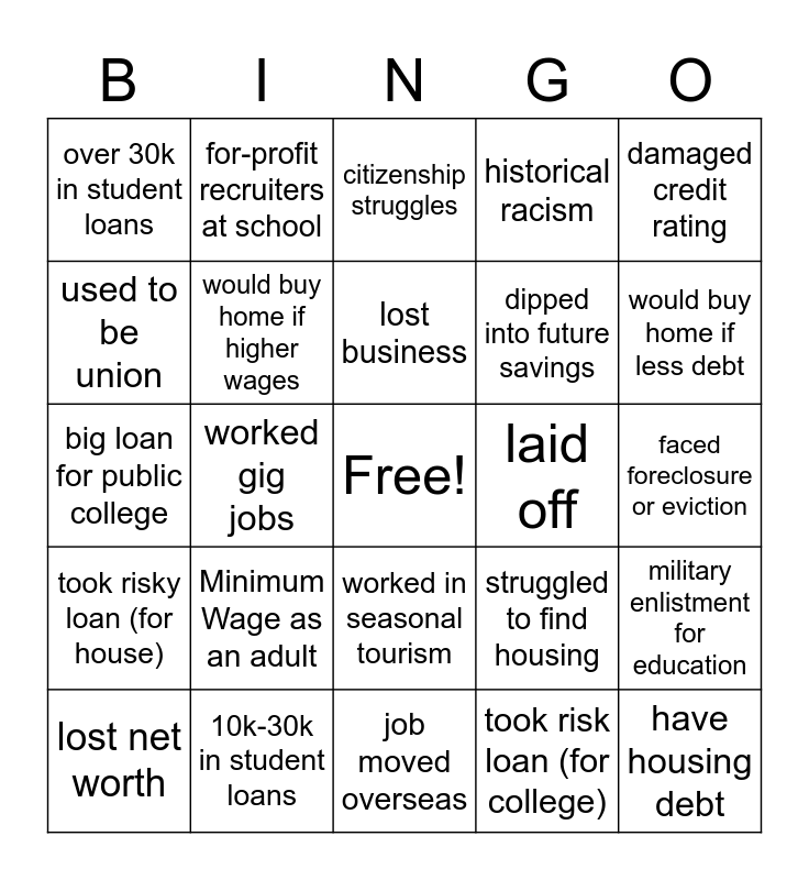 This bingo card has a free space and 24 words: Minimum Wage as an adult, 10k-30k in student loans, lost business, lost net worth, damaged credit rating, over 30k in student loans, used to be union, for-profit recruiters at school, laid off, worked in seasonal tourism, dipped into future savings, big loan for public college, struggled to find housing, military enlistment for education, would buy home if higher wages, took risk loan (for college), faced foreclosure or eviction, citizenship struggles, would buy home if less debt, worked gig jobs, have housing debt, took risky loan (for house), historical racism and job moved overseas.