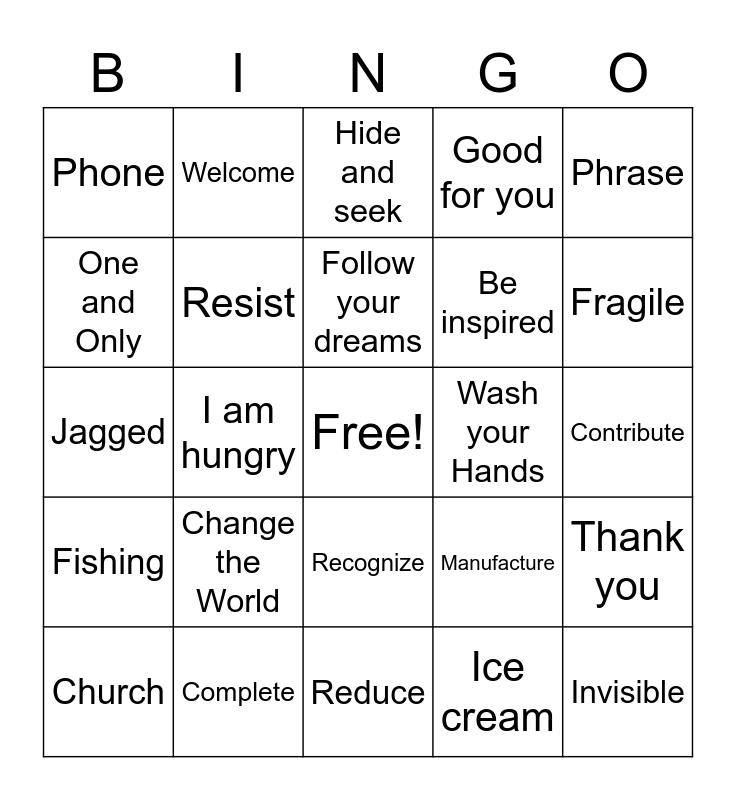 This bingo card has a free space and 24 words: Change the World, Complete, Follow your dreams, Church, Phrase, Phone, One and Only, Welcome, Wash your Hands, Recognize, Be inspired, Jagged, Manufacture, Thank you, Resist, Ice cream, Contribute, Hide and seek, Fragile, I am hungry, Invisible, Fishing, Good for you and Reduce.