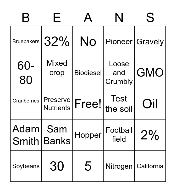 This bingo card has a free space and 24 words: Sam Banks, 30, Biodiesel, Soybeans, Gravely, Bruebakers, 60-80, 32%, Test the soil, Hopper, Loose and Crumbly, Cranberries, Football field, 2%, Mixed crop, Nitrogen, Oil, No, GMO, Preserve Nutrients, California, Adam Smith, Pioneer and 5.
