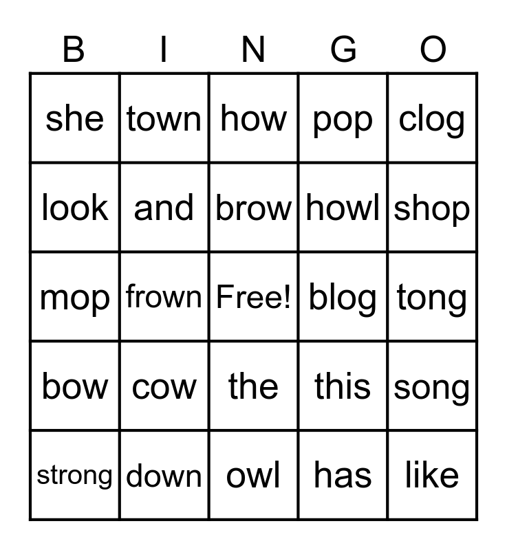 This bingo card has a free space and 24 words: cow, down, brow, strong, clog, she, look, town, blog, the, howl, mop, this, song, and, has, tong, how, shop, frown, like, bow, pop and owl.