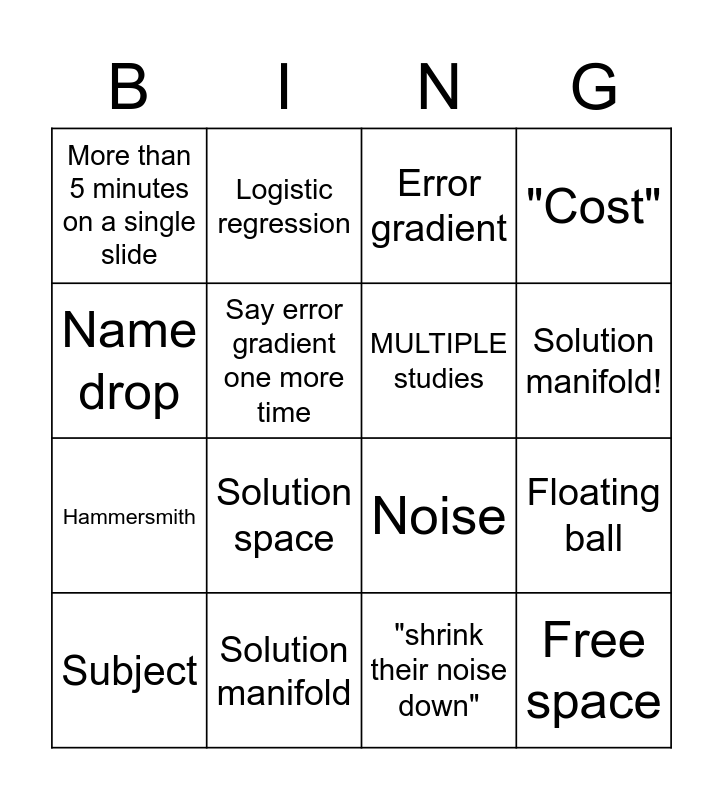 This bingo card has 18 words: Solution space, Free space, Error gradient, More than 5 minutes on a single slide, Noise, "Cost", Subject, Logistic regression, Solution manifold!, Hammersmith, "shrink their noise down", Name drop, Floating ball, Say error gradient one more time, MULTIPLE studies, Mean error, Solution manifold and "MULTIPLE" Studies.