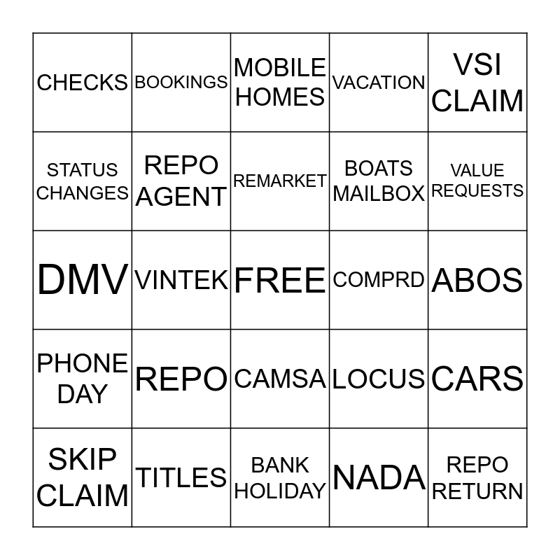 This bingo card has a free space and 24 words: REPO, TITLES, REMARKET, SKIP CLAIM, VSI CLAIM, CHECKS, STATUS CHANGES, BOOKINGS, COMPRD, CAMSA, BOATS MAILBOX, DMV, LOCUS, CARS, REPO AGENT, NADA, ABOS, MOBILE HOMES, VALUE REQUESTS, VINTEK, REPO RETURN, PHONE DAY, VACATION and BANK HOLIDAY.