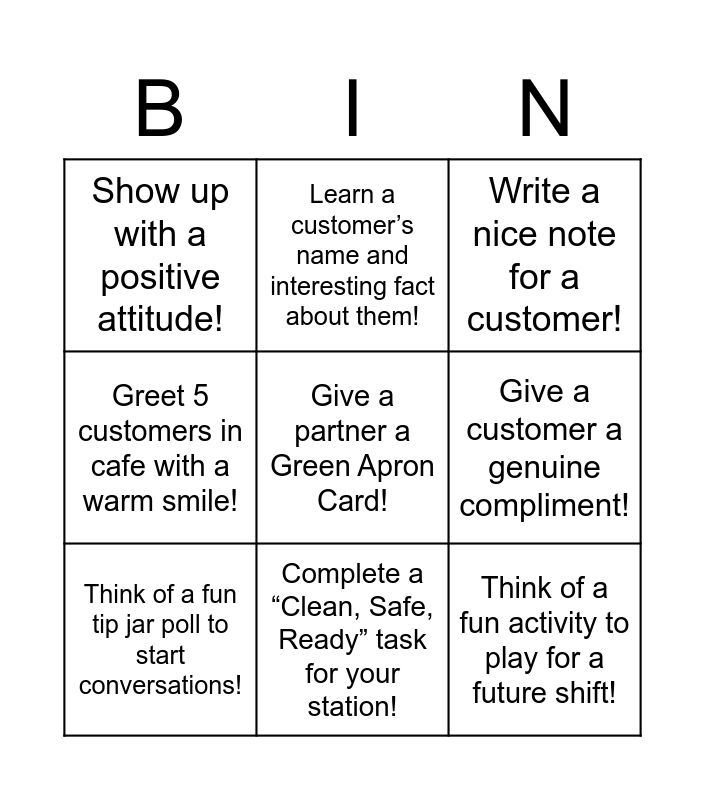 This bingo card has 9 words: Think of a fun tip jar poll to start conversations!, Write a nice note for a customer!, Learn a customer’s name and interesting fact about them!, Greet 5 customers in cafe with a warm smile!, Show up with a positive attitude!, Give a customer a genuine compliment!, Give a partner a Green Apron Card!, Think of a fun activity to play for a future shift! and Complete a “Clean, Safe, Ready” task for your station!.