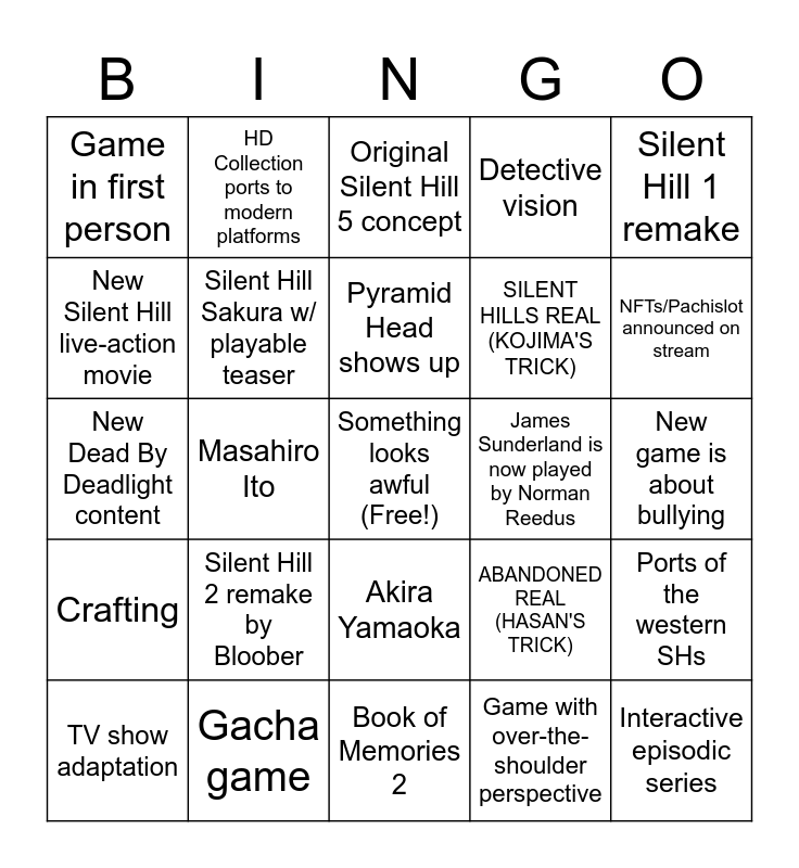 This bingo card has a free space and 24 words: Silent Hill 2 remake by Bloober, Gacha game, Pyramid Head shows up, TV show adaptation, Silent Hill 1 remake, Game in first person, New Silent Hill live-action movie, HD Collection ports to modern platforms, James Sunderland is now played by Norman Reedus, Akira Yamaoka, SILENT HILLS REAL (KOJIMA'S TRICK), New Dead By Deadlight content, ABANDONED REAL (HASAN'S TRICK), Ports of the western SHs, Silent Hill Sakura w/ playable teaser, Game with over-the-shoulder perspective, New game is about bullying, Original Silent Hill 5 concept, NFTs/Pachislot announced on stream, Masahiro Ito, Interactive episodic series, Crafting, Detective vision and Book of Memories 2.