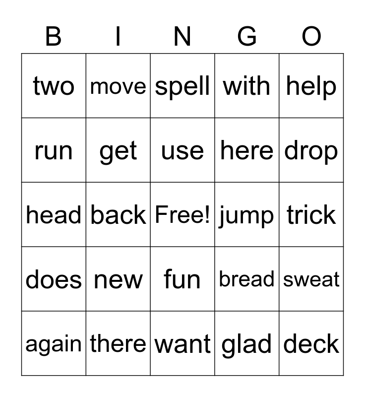 This bingo card has a free space and 24 words: new, there, use, again, help, two, run, move, jump, fun, here, head, bread, sweat, get, glad, trick, spell, drop, back, deck, does, with and want.