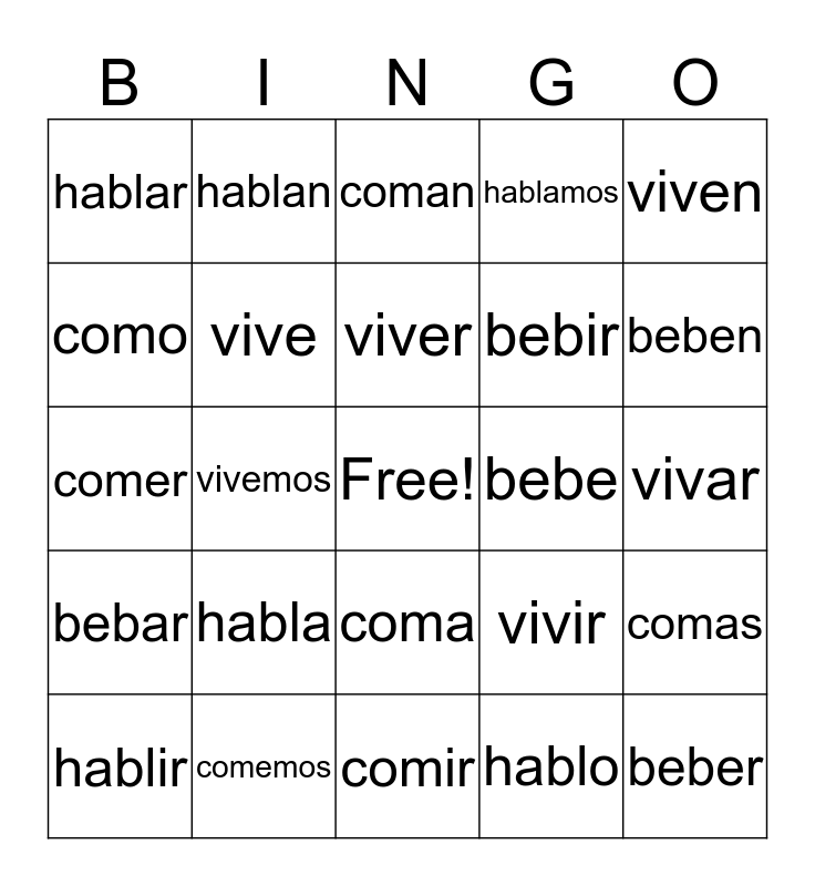 This bingo card has a free space and 24 words: habla, comemos, viver, hablir, viven, hablar, como, hablan, bebe, coma, bebir, comer, vivir, comas, vive, hablo, vivar, coman, beben, vivemos, beber, bebar, hablamos and comir.