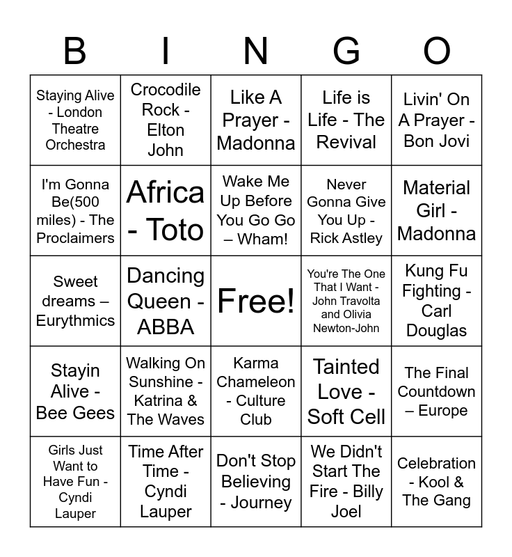 This bingo card has a free space and 39 words: Take on Me - a ha!, Billie Jean - Michael Jackson, Every Breath you Take - The Police, Africa - Toto, Girls Just Want to Have Fun - Cyndi Lauper, Karma Chameleon - Culture Club, Wake Me Up Before You Go Go – Wham!, Two Words - Retrofile, Livin' On A Prayer - Bon Jovi, Stayin Alive - Bee Gees, Dancing Queen - ABBA, Life is Life - The Revival, Celebration - Kool & The Gang, Kung Fu Fighting - Carl Douglas, You're The One That I Want - John Travolta and Olivia Newton-John, Walking On Sunshine - Katrina & The Waves, Bad Dreams - Retrofile, Staying Alive - London Theatre Orchestra, We Built This City - Starship, Tainted Love - Soft Cell, I'm Gonna Be(500 miles) - The Proclaimers, Don't Stop Believing - Journey, Never Gonna Give You Up - Rick Astley, Material Girl - Madonna, Uptown Girl - Billy Joel, Take a Chance On Me - ABBA, One Way or Another - Blondie, Total Eclipse of the Heart - Bonnie Tyler, Dancing In the Dark - Bruce Springsteen, Crocodile Rock - Elton John, Dancing On The Ceiling - Lionel Ritchie, Faith - George Michael, Like A Prayer - Madonna, Time After Time - Cyndi Lauper, We Didn't Start The Fire - Billy Joel, My Sharona - The Knack, The Final Countdown – Europe, Sweet dreams – Eurythmics and I Wanna Dance with Somebody – Whitney Houston.