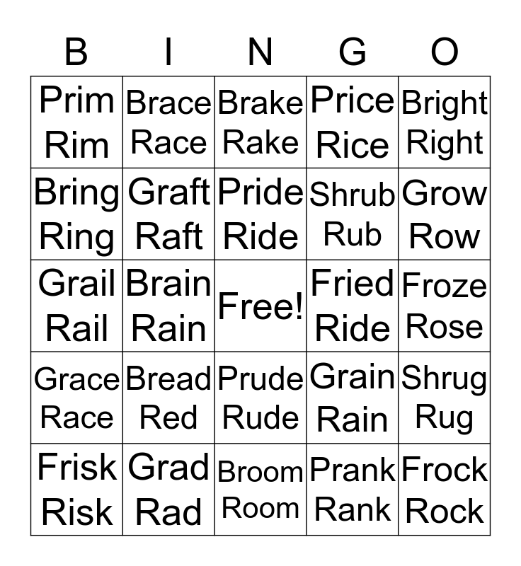 This bingo card has a free space and 24 words: Bread Red, Grad Rad, Pride Ride, Frisk Risk, Bright Right, Prim Rim, Bring Ring, Brace Race, Fried Ride, Prude Rude, Shrub Rub, Grail Rail, Grain Rain, Shrug Rug, Graft Raft, Prank Rank, Froze Rose, Brake Rake, Grow Row, Brain Rain, Frock Rock, Grace Race, Price Rice and Broom Room.